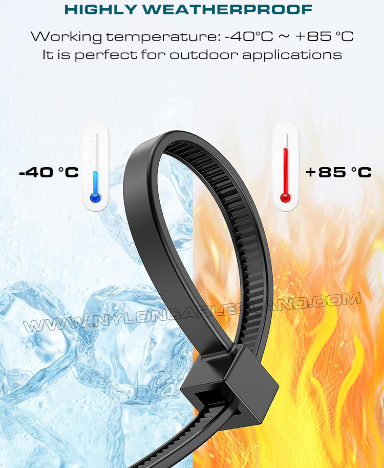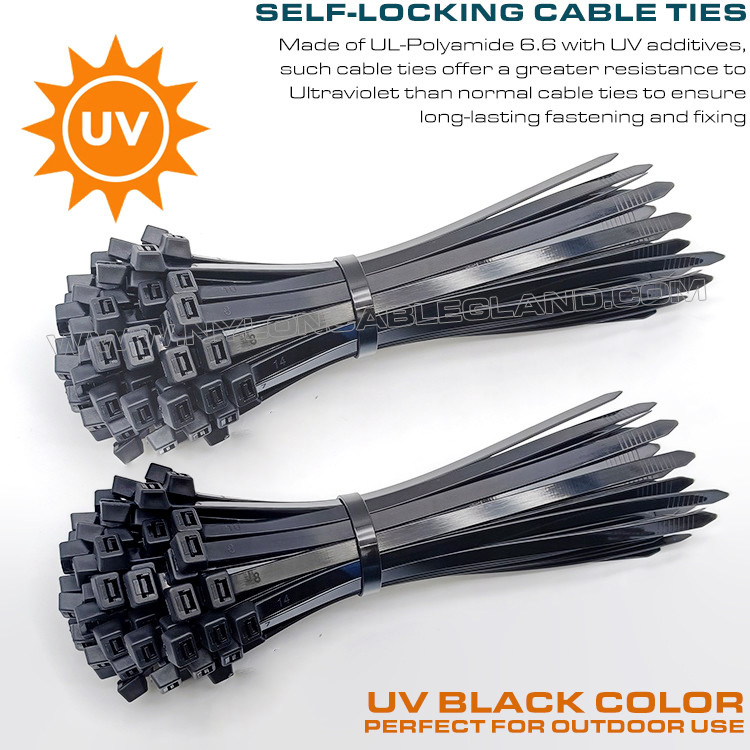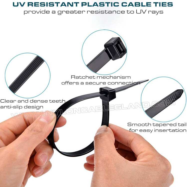 สายรัดเคเบิลทนรังสี UV เป็นสายรัดเคเบิลชนิดหนึ่งที่ทำจากวัสดุพิเศษที่ออกแบบมาสำหรับการใช้งานกลางแจ้งและในสภาพแวดล้อมที่มีรังสี UV สูง ความสามารถในการต้านทานรังสี UV ของดวงอาทิตย์จะเพิ่มขึ้นโดยการเติมสารเติมแต่งที่ทนต่อรังสี UV เช่น คาร์บอนแบล็ก สายรัดเคเบิลเหล่านี้ดูเหมือนสายรัดเคเบิลทั่วไป แต่ด้วยสารเติมแต่งเหล่านี้ ทำให้สายรัดเคเบิลเหล่านี้มีประสิทธิภาพที่ยาวนานและเชื่อถือได้สำหรับทั้งการใช้งานในอุตสาหกรรมและในครัวเรือนในชีวิตประจำวัน โดยเฉพาะอย่างยิ่งในสภาพแวดล้อมกลางแจ้ง สายรัดเคเบิลเหล่านี้เหมาะสำหรับสถานการณ์อุตสาหกรรมต่างๆ (เช่น การมัดสายสื่อสาร การยึดแผงโซลาร์เซลล์) เช่นเดียวกับการใช้งานในครัวเรือนในชีวิตประจำวัน (เช่น การมัดอุปกรณ์ทำสวน การบำรุงรักษาสิ่งอำนวยความสะดวกกลางแจ้ง) ซึ่งเป็นโซลูชันการมัดเคเบิลที่ทนทานและเชื่อถือได้