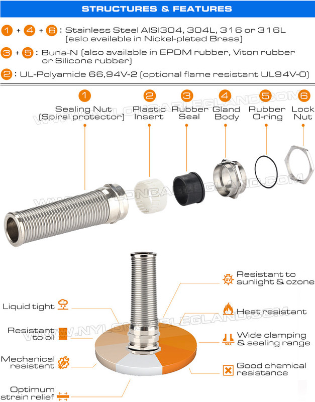 AISI316L, AISI316, AISI304 Stainless Steel Metal PG Flexible Cable Gland (IP68) with Additional Spiral Strain Relief comes with an additional spiral protector which can prevent cables from excessive bending and breakage and help to extend cable life.