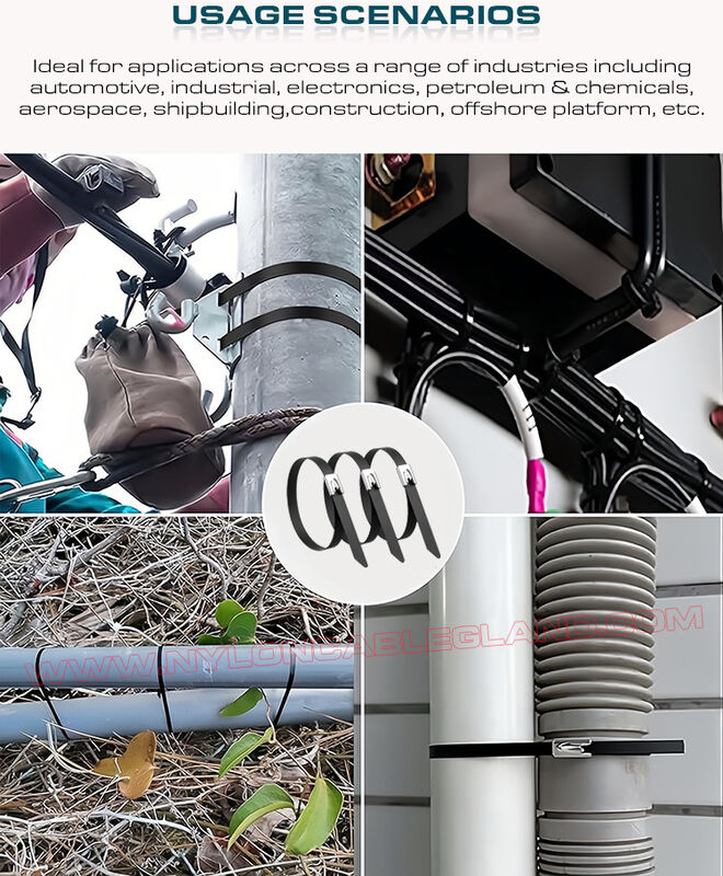 • สถานประกอบการด้านพลังงาน: การยึดและมัดสายไฟฟ้า การมัดท่ออุตสาหกรรม การยึดและมัดท่อ วาล์ว ปั๊ม และอุปกรณ์อื่นๆ ในอุตสาหกรรมปิโตรเคมี การยึดสายไฟและสายเคเบิลสำหรับการติดตั้งพลังงานแสงอาทิตย์และพลังงานลม.
