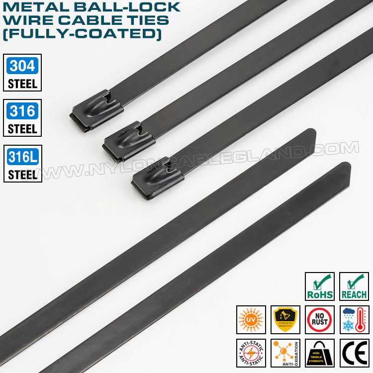 เคเบิ้ลไทร์สแตนเลสเคลือบเต็มแผ่น (สายรัดเคเบิ้ลไทร์โลหะ) เป็นอุปกรณ์ยึดชนิดหนึ่งที่มีระบบล็อคแบบลูกบอลและเคลือบอีพ็อกซี่ (โพลีเอสเตอร์หรือไนลอน 11) เต็มแผ่น หัวเข็มขัดและสายรัดทำจากสแตนเลส 304, 316 หรือ 316L และพื้นผิวทั้งหมดถูกเคลือบด้วยวัสดุอีพ็อกซี่ (โพลีเอสเตอร์หรือไนลอน 11) สารเคลือบสามารถให้การปกป้องเพิ่มเติมแก่สายรัดเคเบิล ทำให้ทนต่อการกัดกร่อน ทนต่อการสึกหรอ และสวยงามยิ่งขึ้น มีการใช้งานอย่างแพร่หลายสำหรับการยึดและรัดในด้านระบบไฟฟ้า อุตสาหกรรมเคมี การเดินเรือ ปิโตรเลียม เครื่องจักร ท่อ สายไฟ สวน ฟาร์ม ฯลฯ